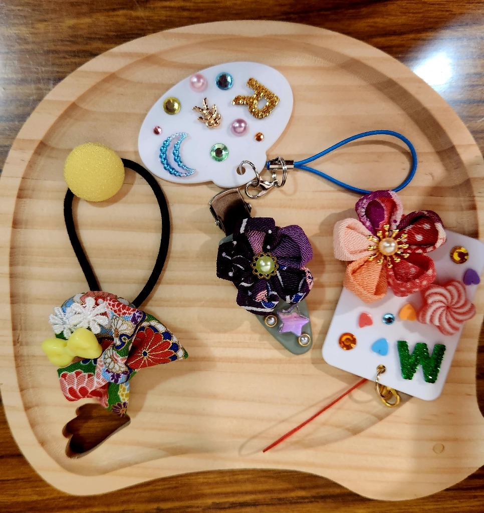 つまみ細工の ヘアーゴムや イヤリングなどの