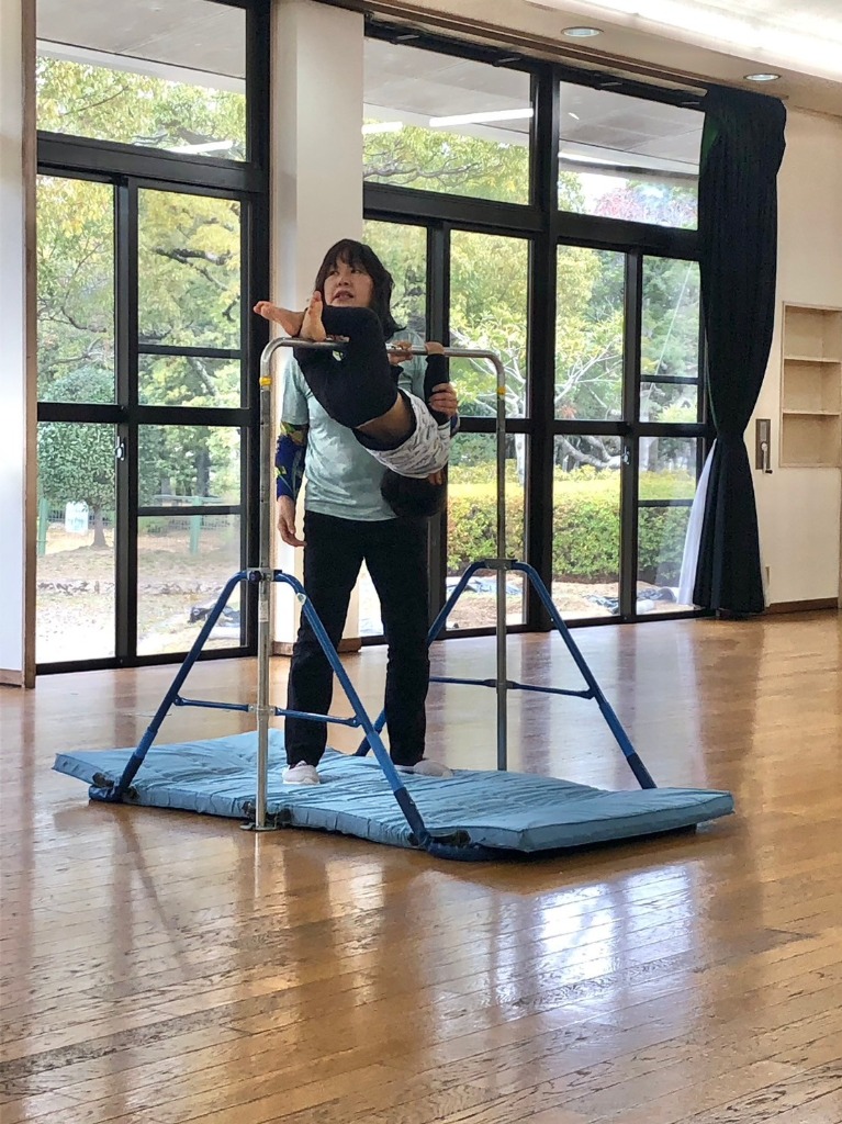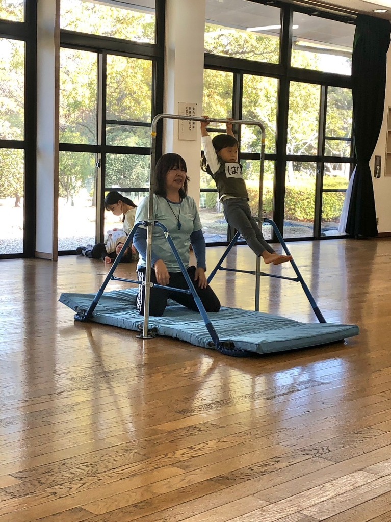 ボディーバー(低反発マット)や鉄棒を使い、親子で楽しく遊びながら体幹トレーニングを行います。