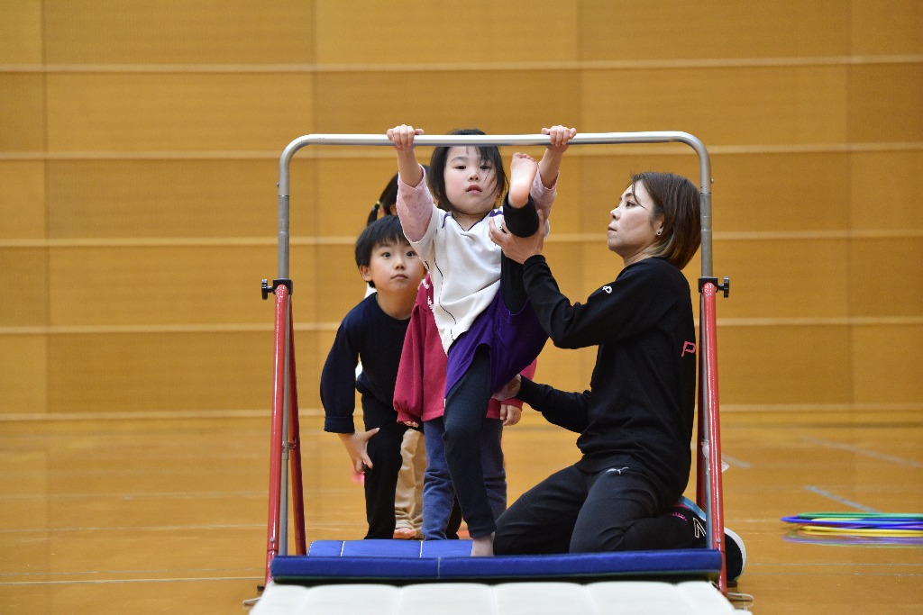 ボディーバー(低反発マット)や鉄棒を使い、親子で楽しく遊びながら体幹トレーニングを行います。